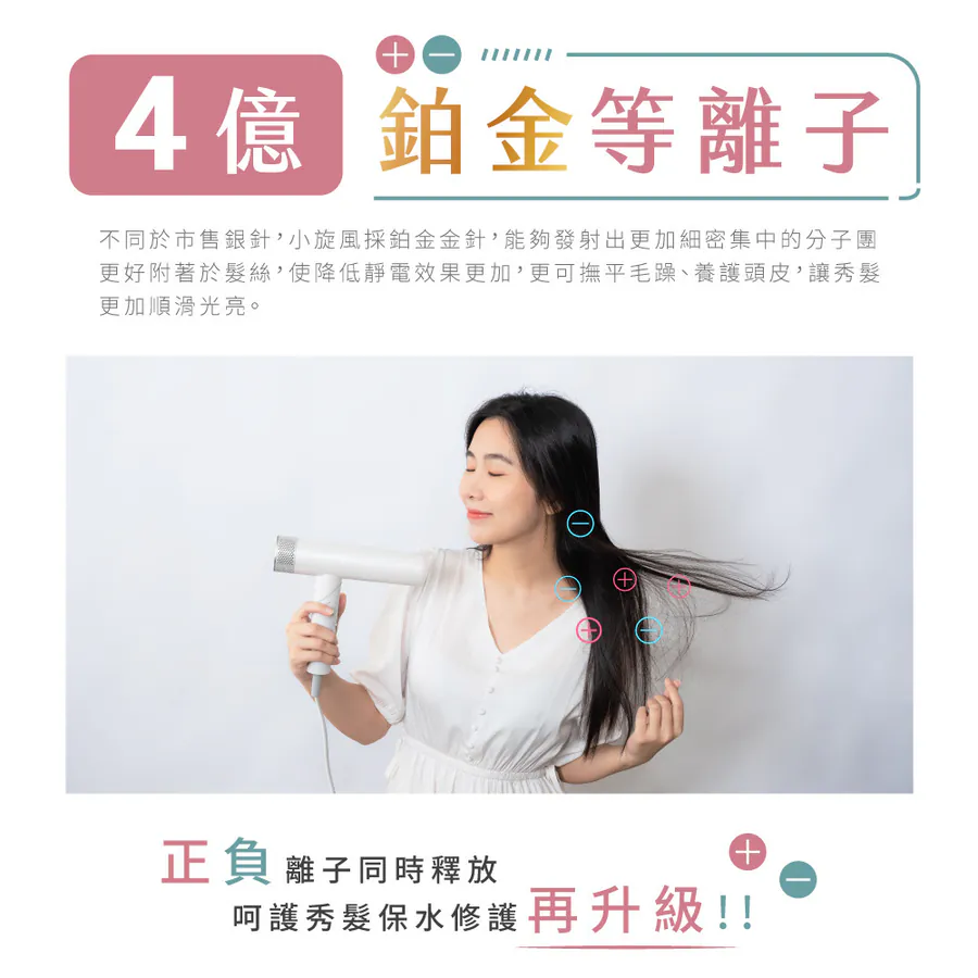 - 4億濃度箔金等離子,正負離子同時釋放,養護頭皮、保濕修護再升級!!